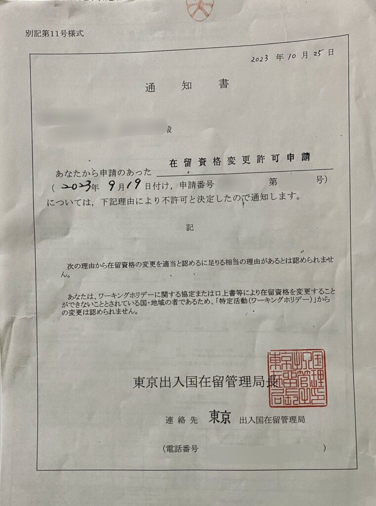 But because of his nationality (Argentina), we found out that he cannot change his visa from working holiday to work visa within Japan. We first tried to submit “Change of Status of Residence”(在留資格変更許可申請書)with all the documents prepared, but after one month, we received the rejection result from the Immigration office like below.